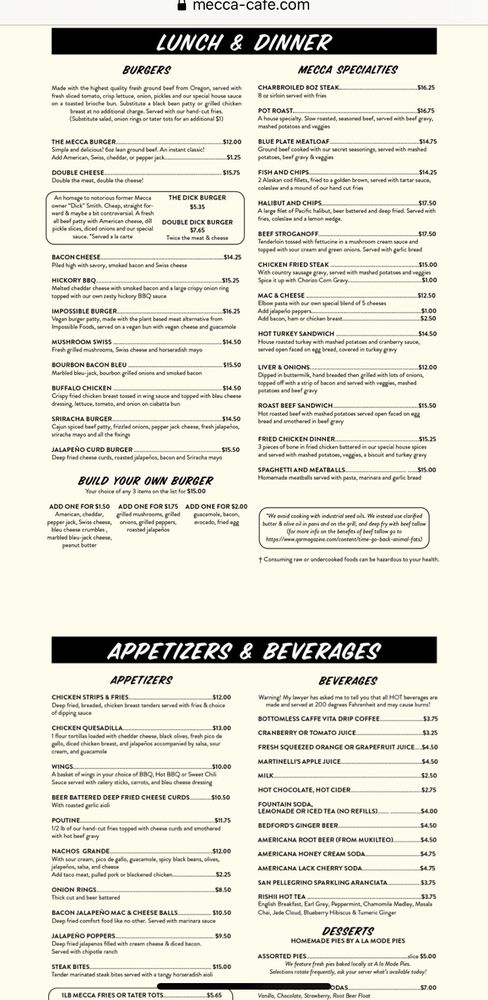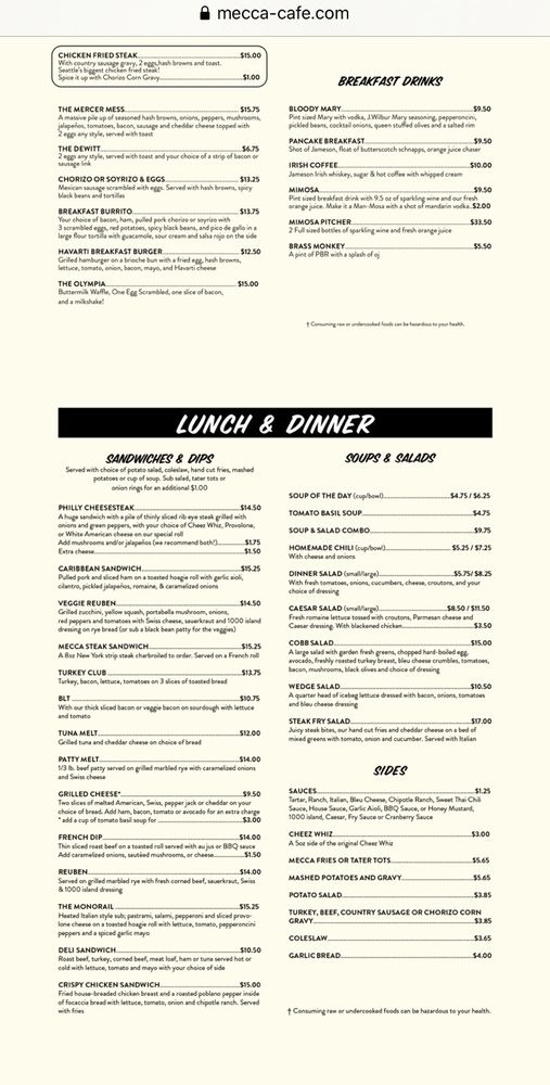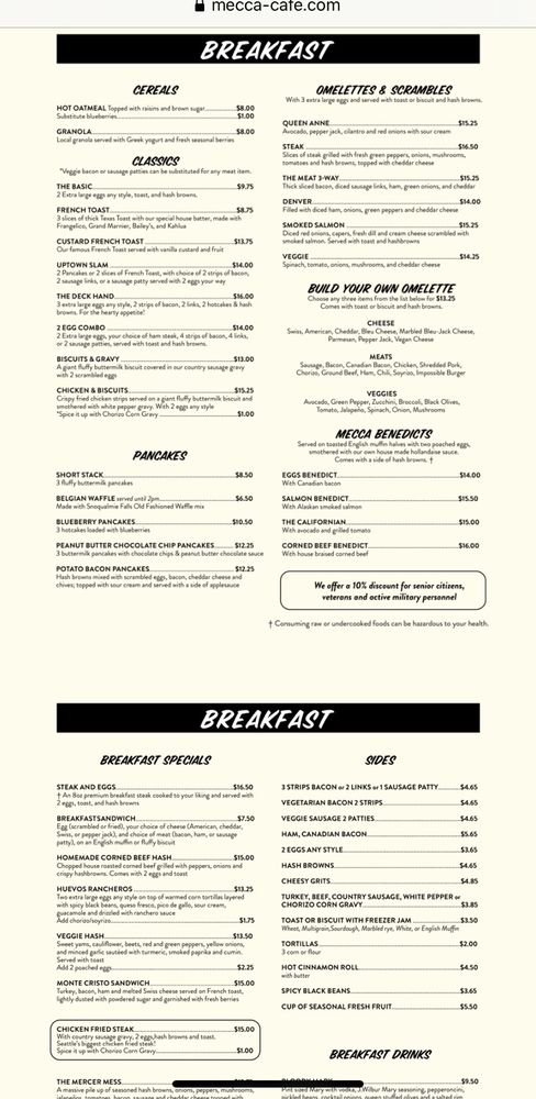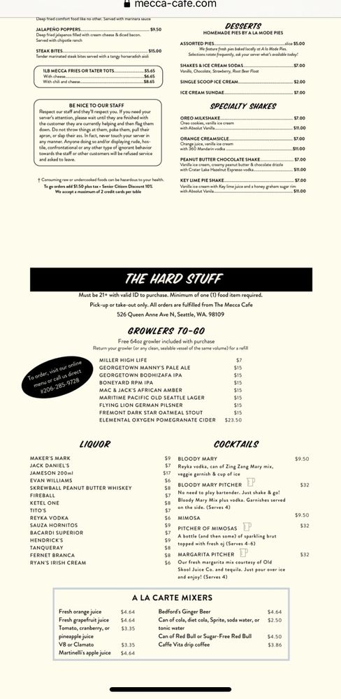 Mecca Cafe, located in Seattle, is a must-visit American bar that offers a range of delicious options. From appetizers like Bacon Jalapeno Mac & Cheese Balls to breakfast classics like Chicken Fried Steak, Mecca Cafe has something for everyone. Customers rave about the efficient service and generous portions, making it the go-to spot for breakfast. The retro interior adds to the charm, creating a unique dining experience. The menu also features a variety of beverages, including Americana Blk Cherry and Bedfords Ginger Beer. Whether you're looking for a casual meal or a satisfying breakfast, Mecca Cafe is the perfect choice. Don't miss out on their happy hour specials and full bar offerings. Visit Mecca Cafe for a memorable dining experience.
